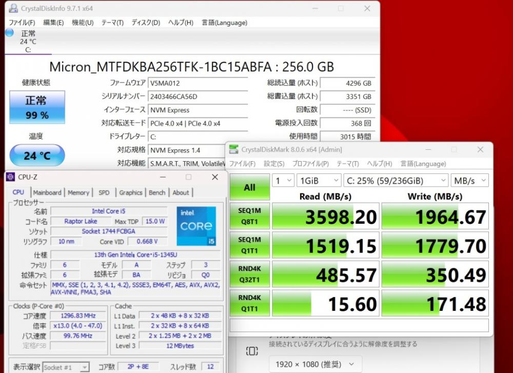 | CPU: 超高速 Intel 10コア 卓越性能 第13世代Core i5-1345U 1.6Ghz、 10コア12スレッド (ターボ・ブースト利用時の最大周波数 4.7GHz) |