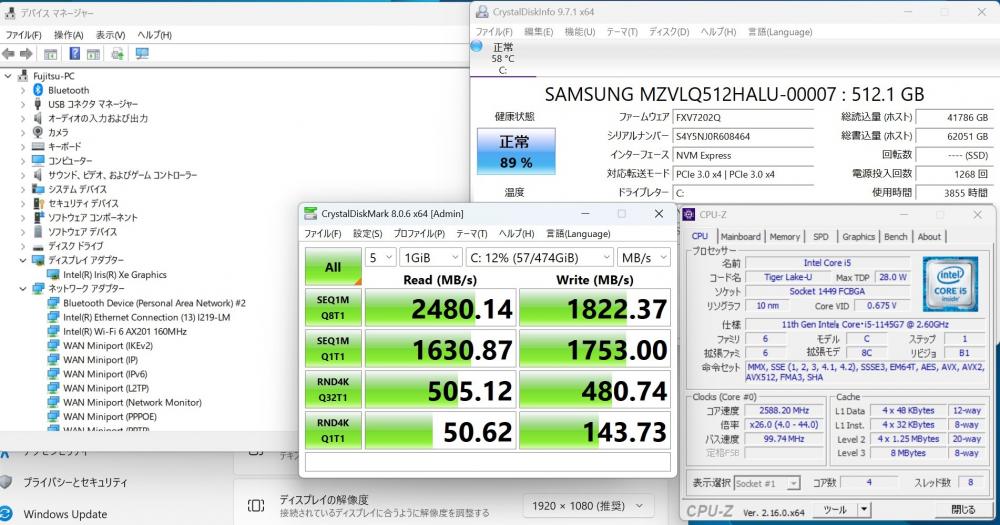 CPU:    超高速 Intel 卓越性能 第11世代Core i5-1145G7 2.6Ghz、 4コア8スレッド (ターボ・ブースト利用時の最大周波数 4.4GHz)