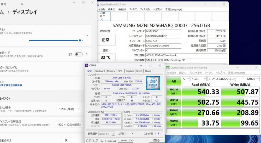 | CPU: 超高速 Intel 高性能 第8世代Core i5-8365u 1.6Ghz、 4コア8スレッド (ターボ・ブースト利用時の最大周波数 4.1GHz) |
