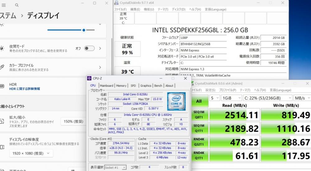 | CPU: 超高速 Intel 高性能 第8世代Core i5-8250u 1.6Ghz、 4コア8スレッド (ターボ・ブースト利用時の最大周波数 3.4GHz) |