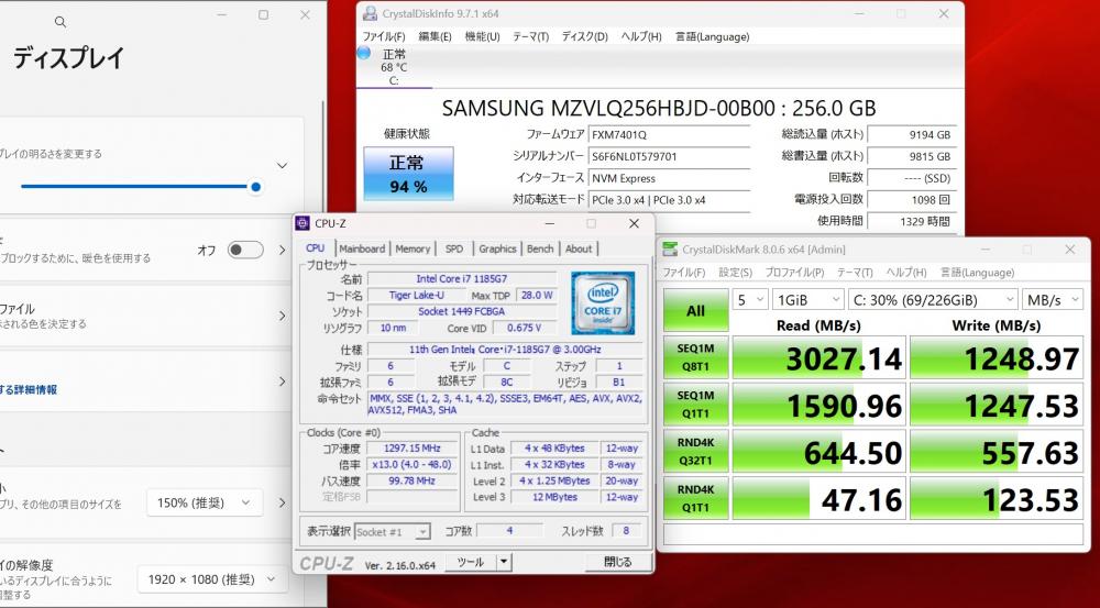 | CPU: 卓越性能 第11世代Core i7-1185G7 3.0Ghz、 4コア8スレッド (ターボ・ブースト利用時の最大周波数 4.8GHz) |