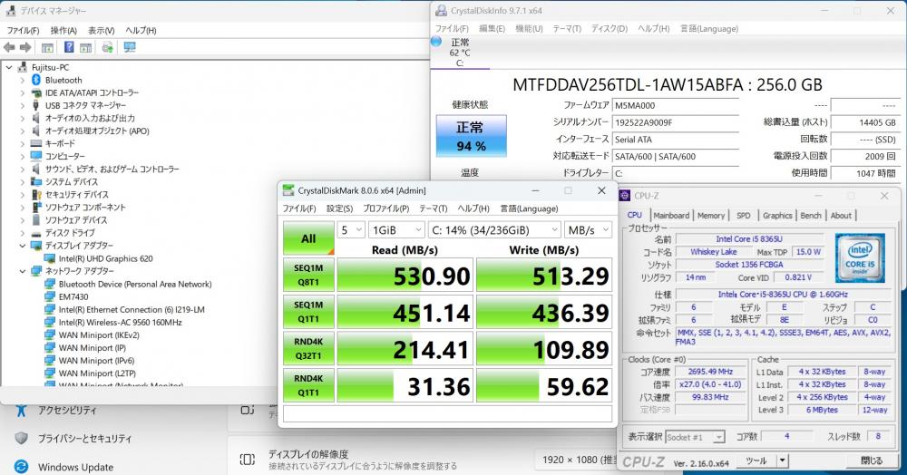 | CPU: 超高速 Intel 高性能 第8世代Core i5-8365U 1.6Ghz、 4コア8スレッド (ターボ・ブースト利用時の最大周波数 4.1GHz) |