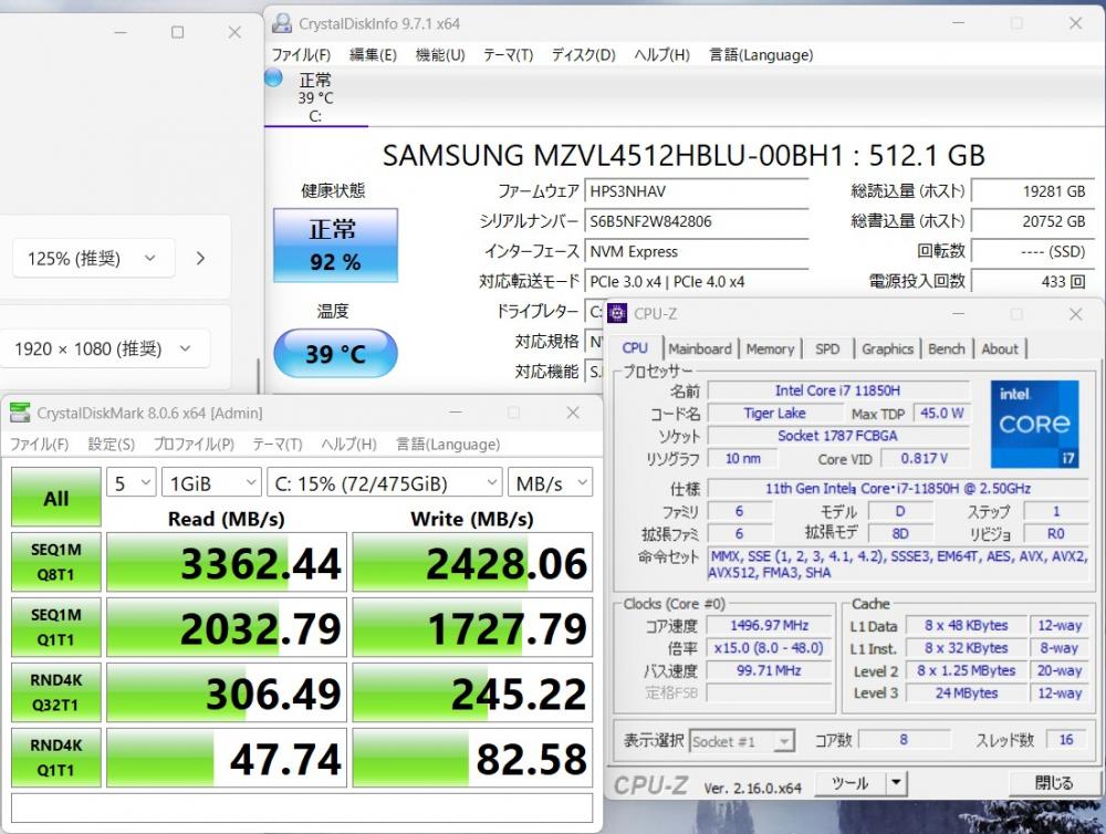 | CPU: 超高速 Intel 8コア 卓越性能 第11世代Core i7-11850H 2.5Ghz、 8コア16スレッド (ターボ・ブースト利用時の最大周波数 4.8GHz) |