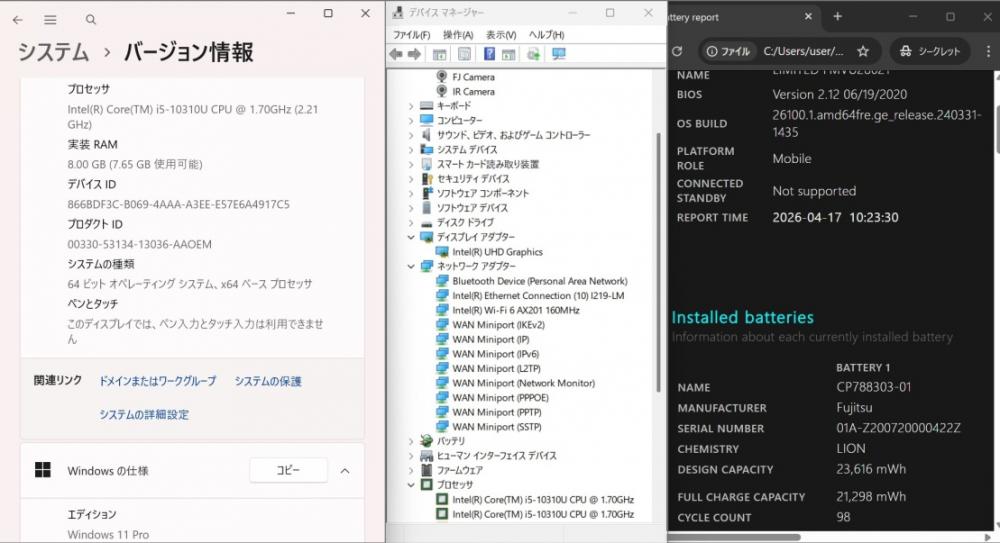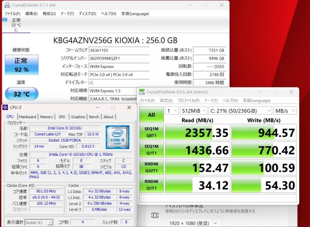 CPU:    超高速 Intel 超高性能 第10世代Core i5-10310u 1.7Ghz、 4コア8スレッド (ターボ・ブースト利用時の最大周波数 4.4GHz)
