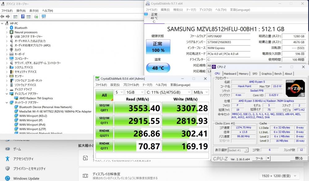 | CPU: 超高速 高性能 AMD Ryzen 5-8640U 3.5Ghz、 6コア12スレッド (ターボ・ブースト利用時の最大周波数 4.9GHz) |