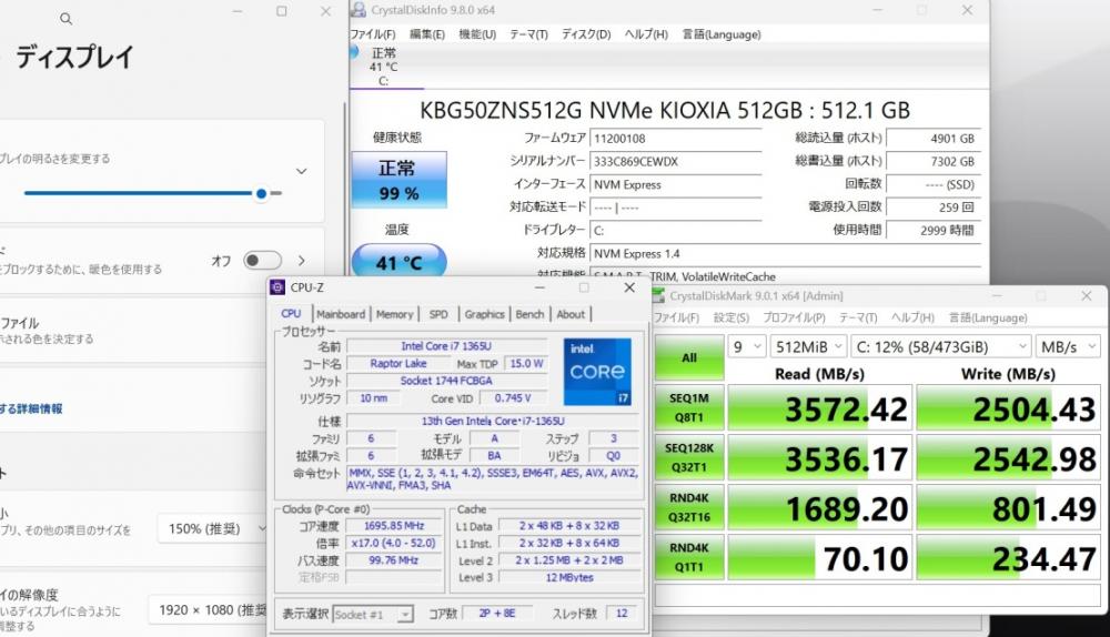 | CPU: 超高速 Intel 10コア 卓越性能 第13世代Core i7-1365u 1.8Ghz、 10コア12スレッド (ターボ・ブースト利用時の最大周波数 5.2GHz) |