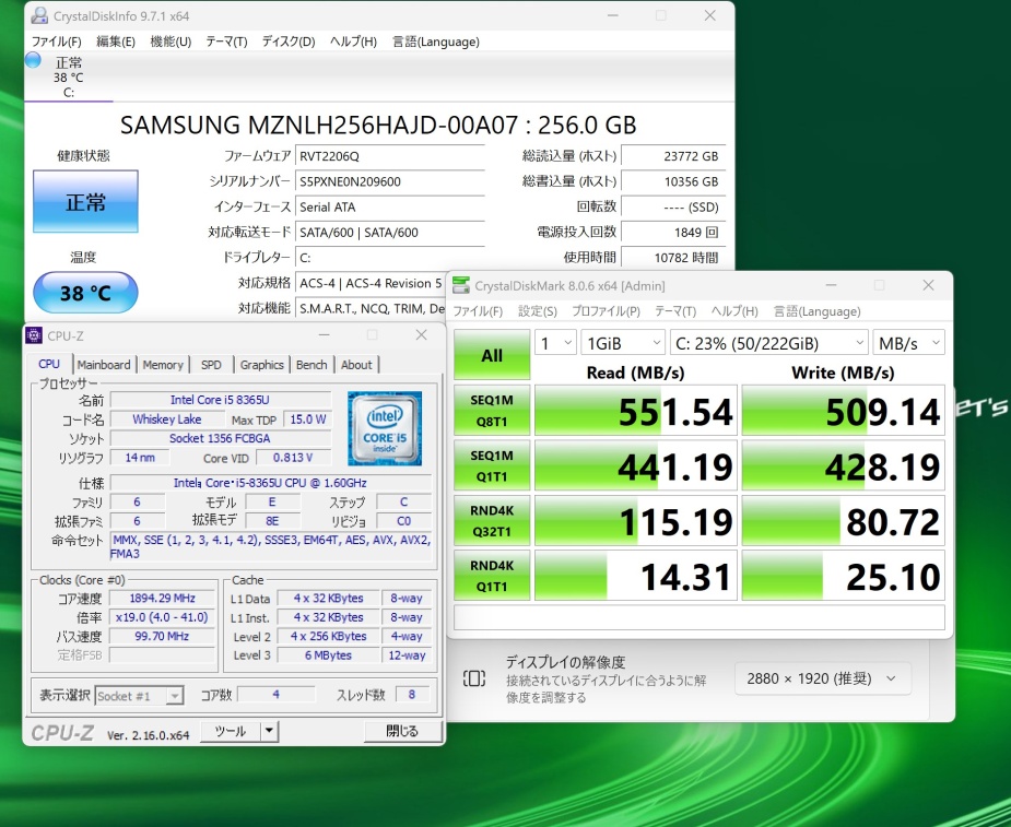 | CPU: 超高速 Intel 高性能 第8世代Core i5-8365U 1.6Ghz、 4コア8スレッド (ターボ・ブースト利用時の最大周波数 4.1GHz) |