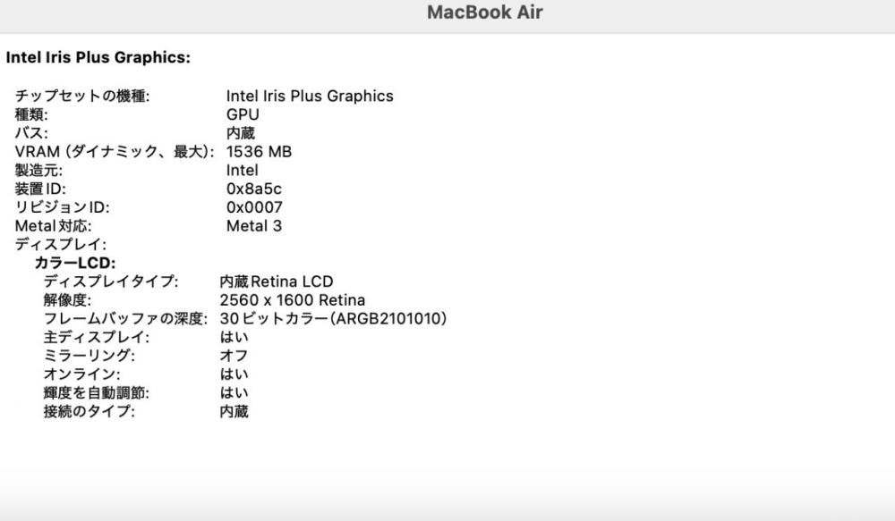 | ディスプレイ: 2K液晶 13.3インチ光沢液晶 高輝度 広視野角 LEDバックライト 2560 x 1600解像度 Retina ディスプレイ搭載により文字や写真を滑らかに表現することができます。———— |