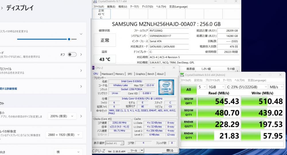 | CPU: 超高速 Intel 高性能 第8世代Core i5-8365u 1.6Ghz、 4コア8スレッド (ターボ・ブースト利用時の最大周波数 4.1GHz) |