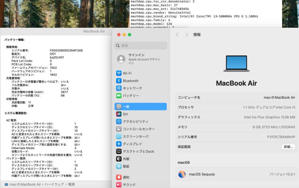 充放電回数11回 中古美品 2K液晶 13.3型 Apple MacBoko Air A2179 (2020年) グレー macOS 15 Sequoia(正規Win11追加可) 第10世代 i3-1000NG4 8GB NVMe 256GB-SSD カメラ 無線 中古パソコン 管:1143h