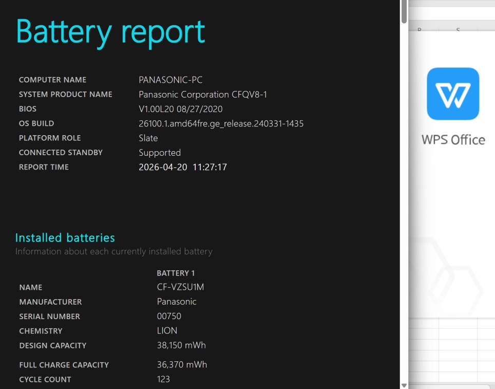 バッテリー電池の健康度は 95% です。4時間位も使用可能と表示されている。 バッテリーは消耗品の為、動作補償外となります。