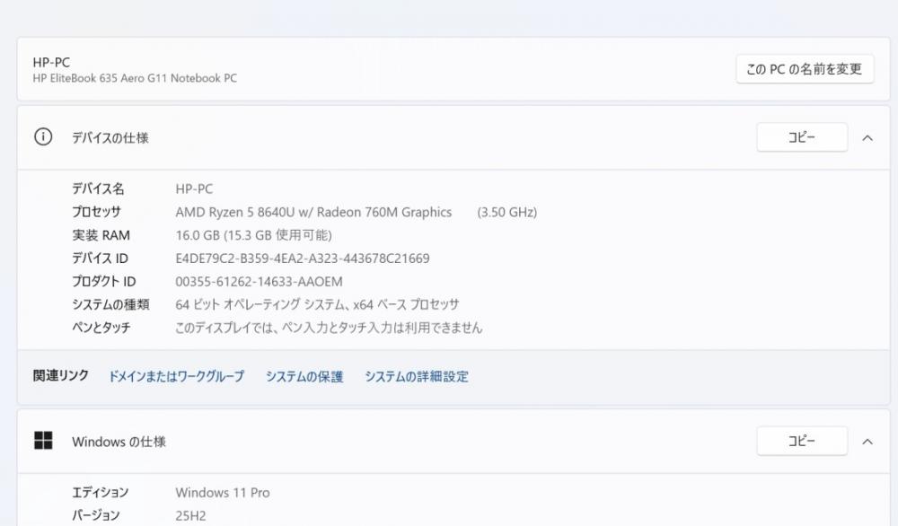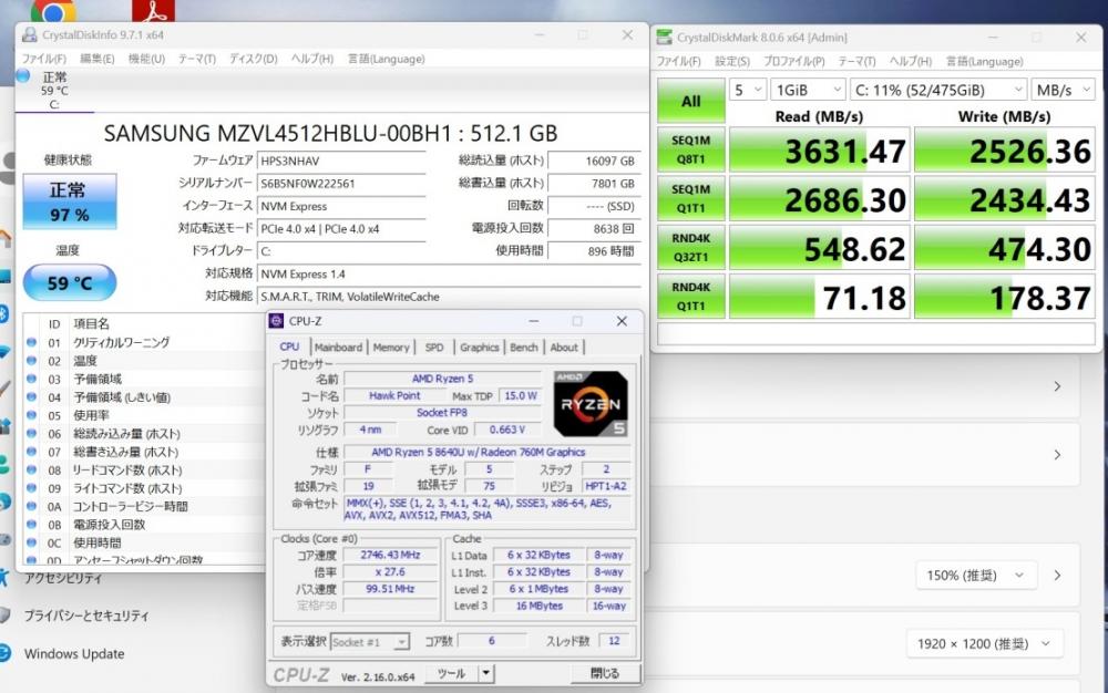 | CPU: 超高速 高性能 AMD Ryzen 5-8640u 3.5Ghz、 6コア12スレッド (ターボ・ブースト利用時の最大周波数 4.9GHz) |