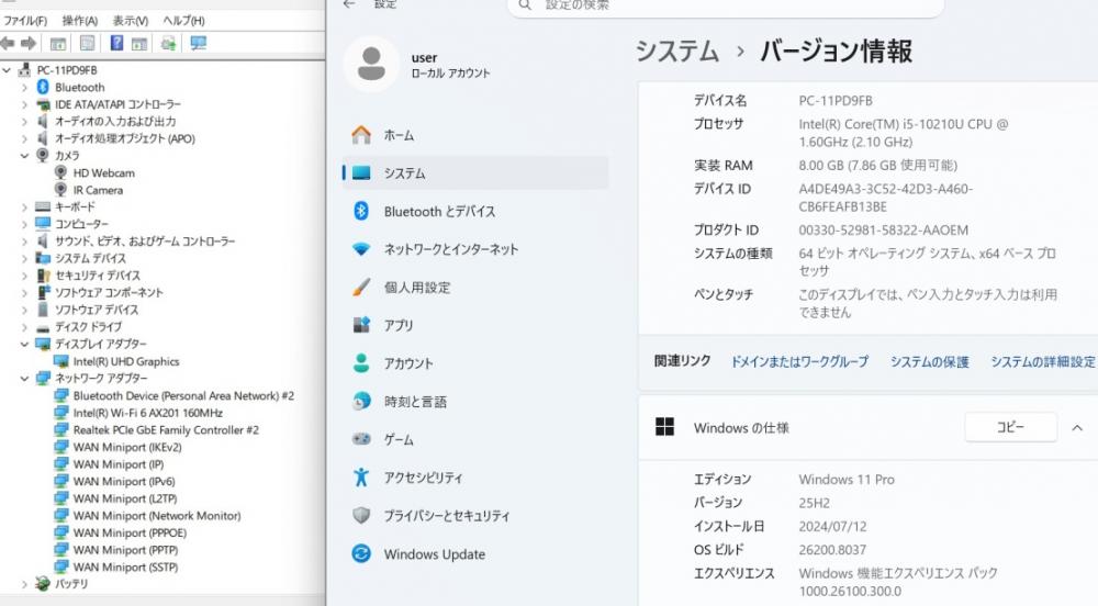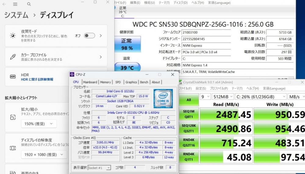 | CPU: 超高速 Intel 超高性能 第10世代Core i5-10210u 1.6Ghz、 4コア8スレッド (ターボ・ブースト利用時の最大周波数 4.2GHz) |