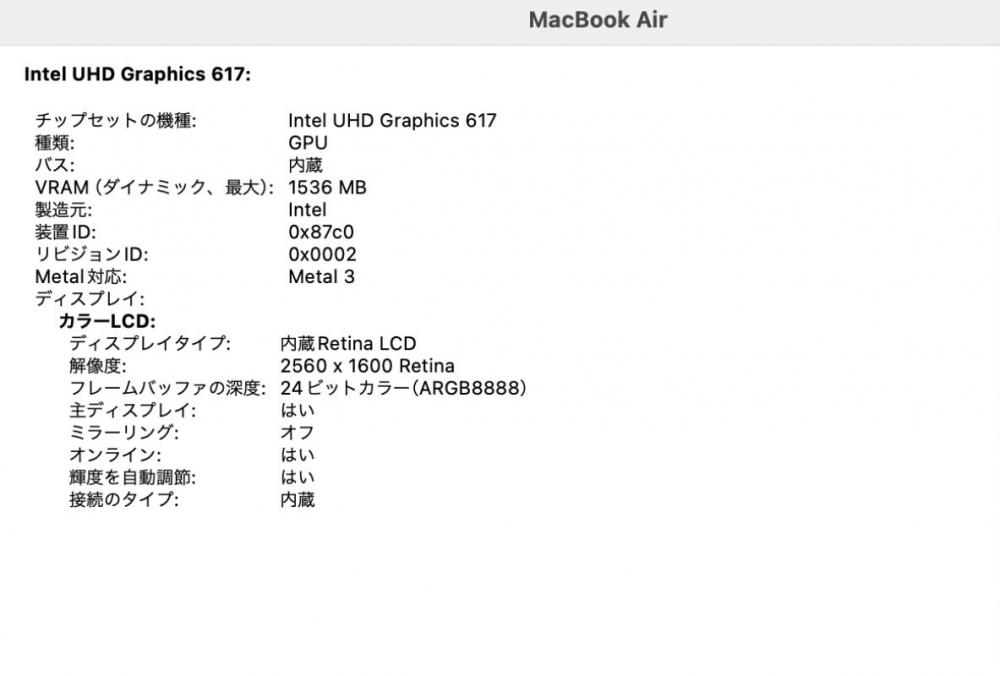 | ディスプレイ: 2K液晶 13.3インチ光沢液晶 高輝度 広視野角 LEDバックライト 2560 x 1600解像度 Retina ディスプレイ搭載により文字や写真を滑らかに表現することができます。———— |
