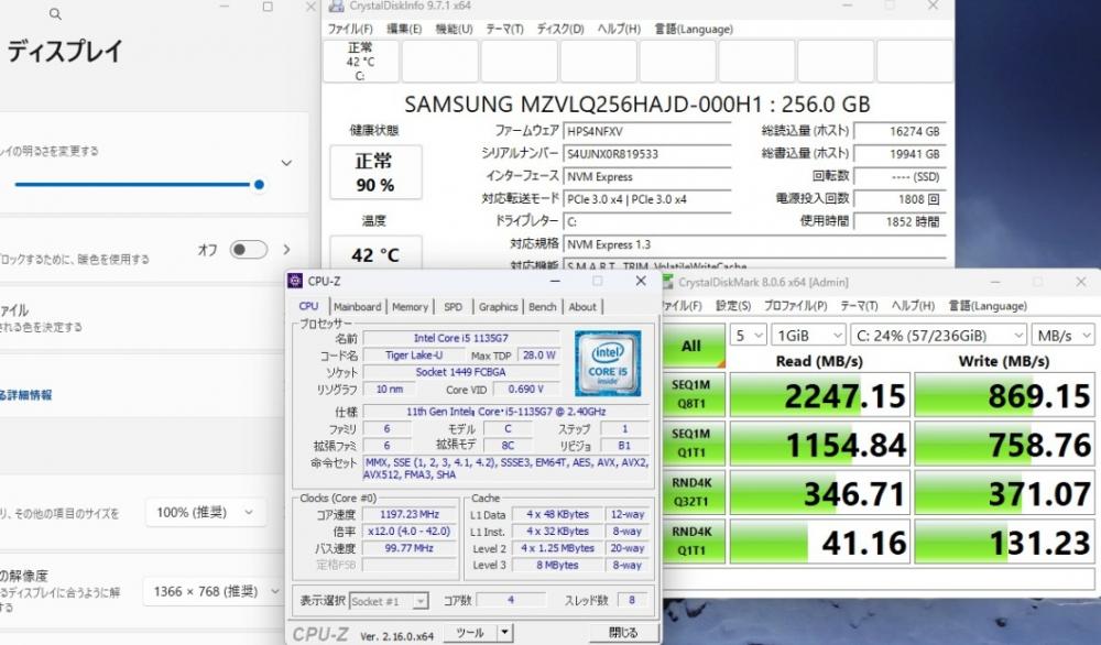 CPU:    超高速 Intel 卓越性能 第11世代Core i5-1135G7 2.4Ghz、 4コア8スレッド (ターボ・ブースト利用時の最大周波数 4.2GHz)