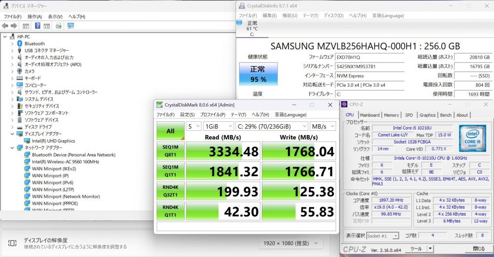 | CPU: 超高速 Intel 超高性能 第10世代Core i5-10210U 1.6Ghz、 4コア8スレッド (ターボ・ブースト利用時の最大周波数 4.2GHz) |