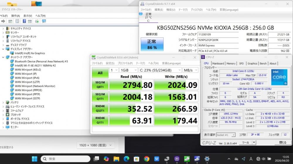 | CPU: 超高速 Intel 10コア 卓越性能 第12世代Core i5-1235u 1.3Ghz、 10コア12スレッド (ターボ・ブースト利用時の最大周波数 4.4GHz) |