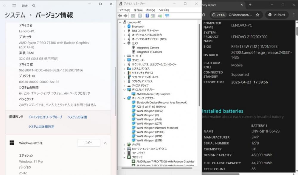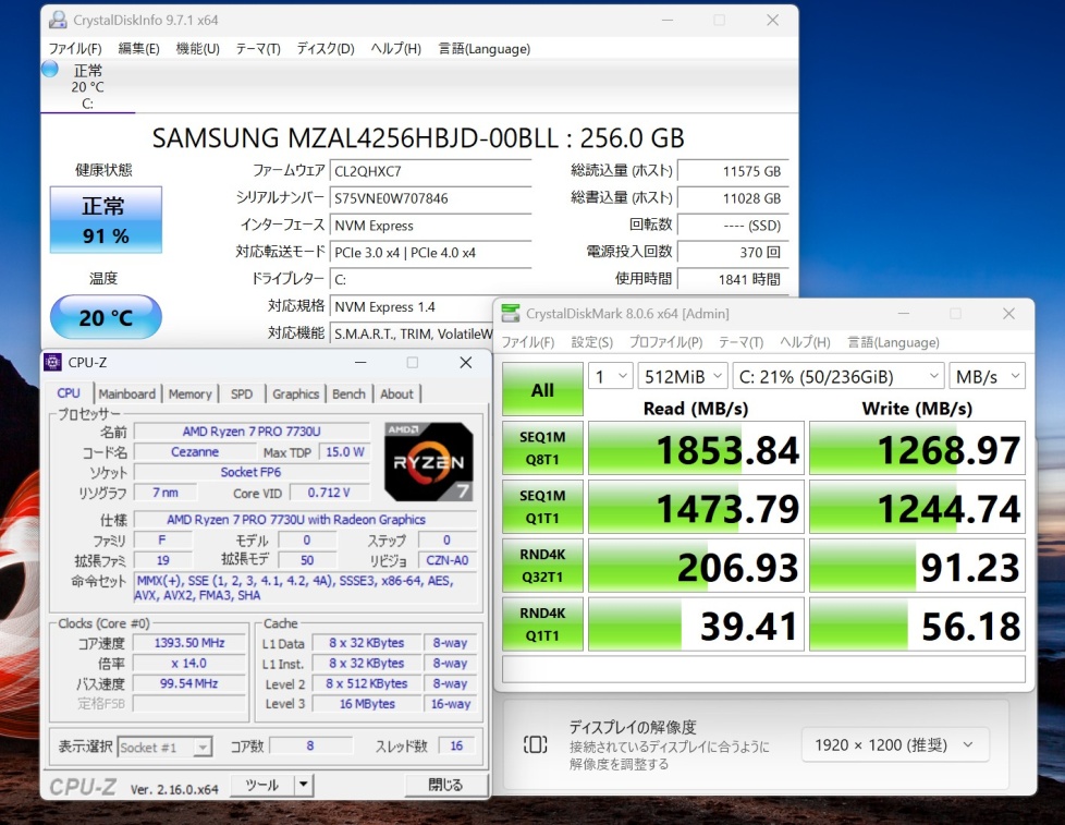 | CPU: 高速 8コア AMD Ryzen 7 Pro 7730U 2.0Ghz、 8コア16スレッド (ターボ・ブースト利用時の最大周波数 4.5GHz) |