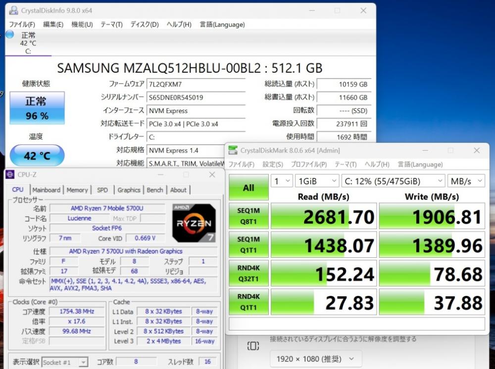 | CPU: 超高速 8コア 超高性能 AMD Ryzen 7-5700U 1.8Ghz、 8コア16スレッド (ターボ・ブースト利用時の最大周波数 4.3GHz) |