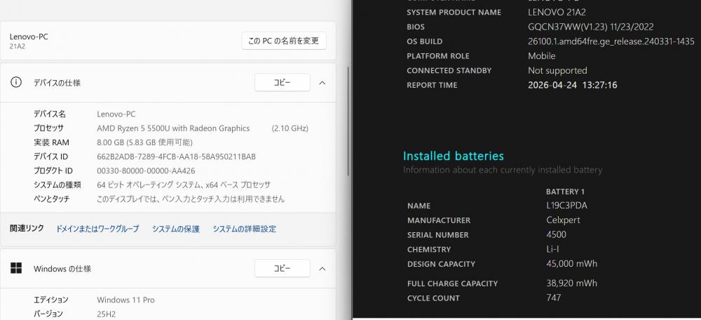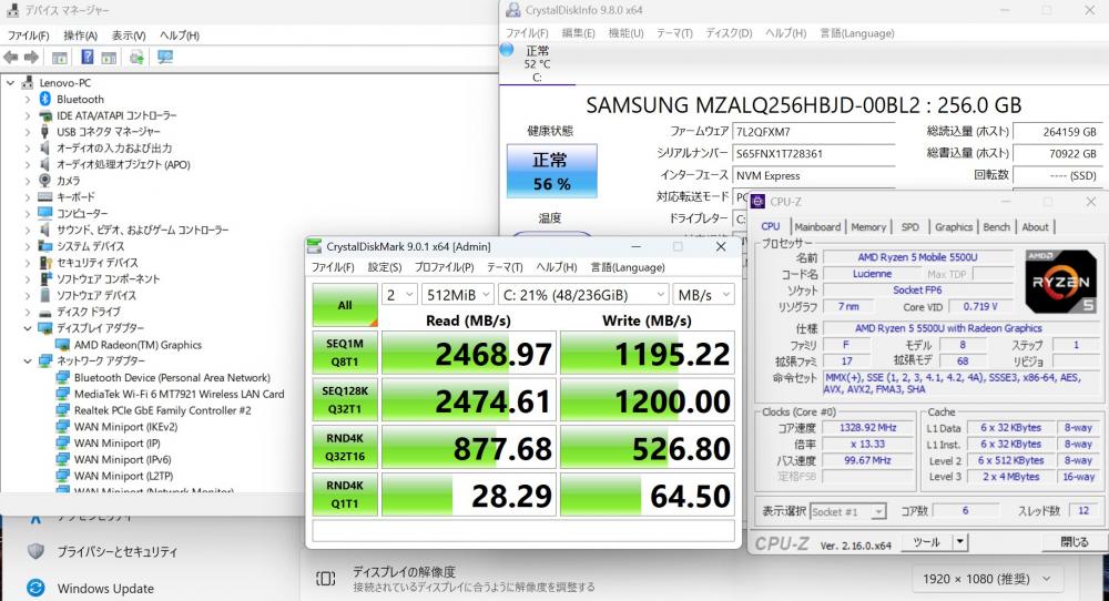 | CPU: 超高速 高性能 AMD Ryzen 5-5500U 2.1Ghz、 6コア12スレッド (ターボ・ブースト利用時の最大周波数 4.0GHz) |