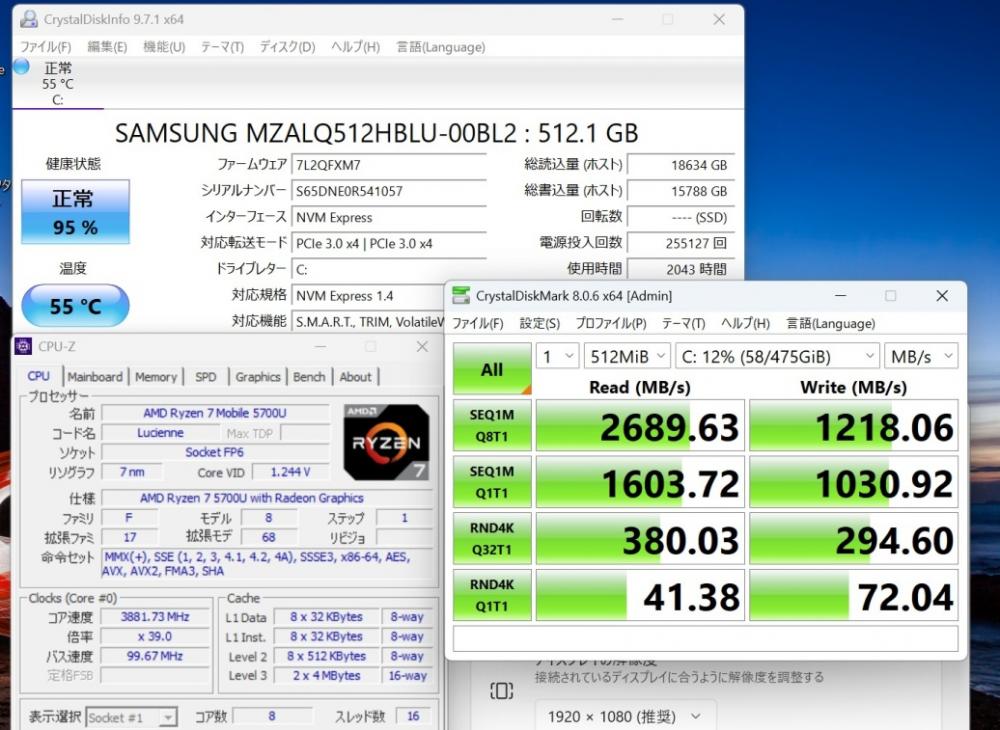 CPU:    超高速 8コア 超高性能 AMD Ryzen 7-5700U 1.8Ghz、 8コア16スレッド (ターボ・ブースト利用時の最大周波数 4.3GHz)