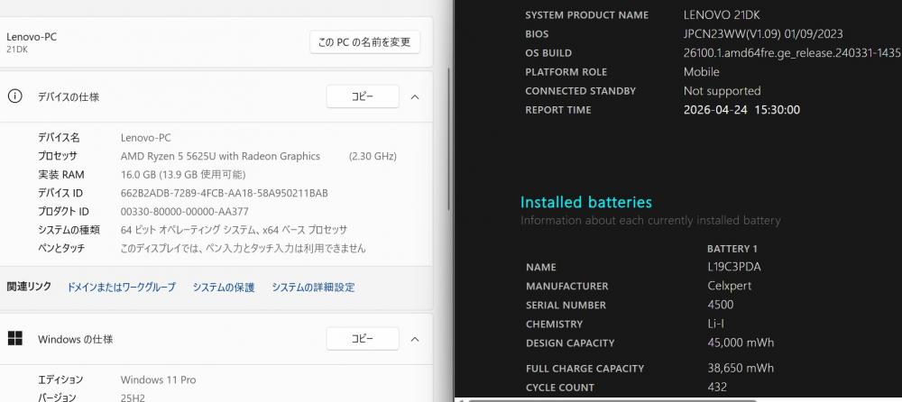 バッテリー電池の健康度は 85% です。3時間半位も使用可能と表示されている。 バッテリーは消耗品の為、動作補償外となります。