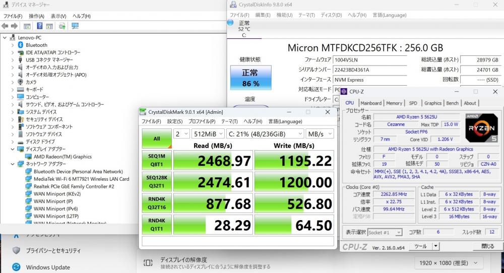 CPU:    超高速 高性能 AMD Ryzen 5-5625U 2.3Ghz、 6コア12スレッド (ターボ・ブースト利用時の最大周波数 4.3GHz)