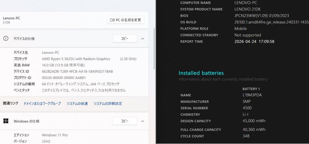 バッテリー電池の健康度は 89% です。4時間位も使用可能と表示されている。 バッテリーは消耗品の為、動作補償外となります。