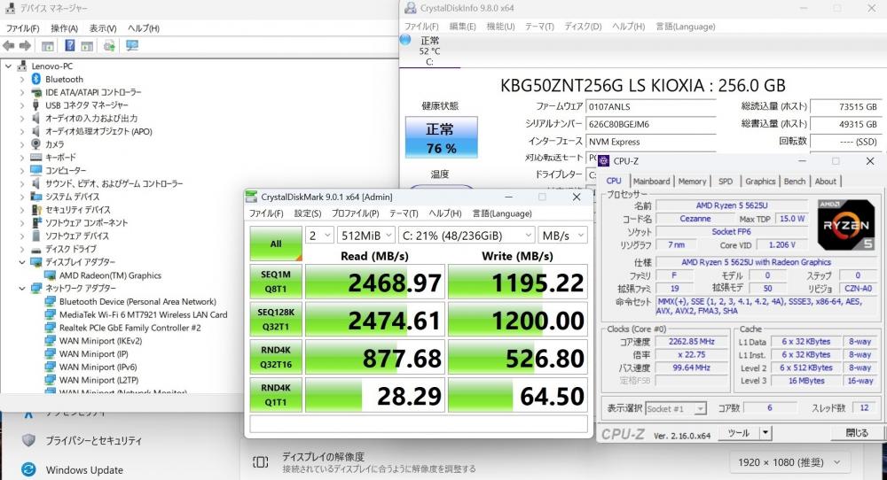 CPU:    超高速 高性能 AMD Ryzen 5-5625U 2.3Ghz、 6コア12スレッド (ターボ・ブースト利用時の最大周波数 4.3GHz)