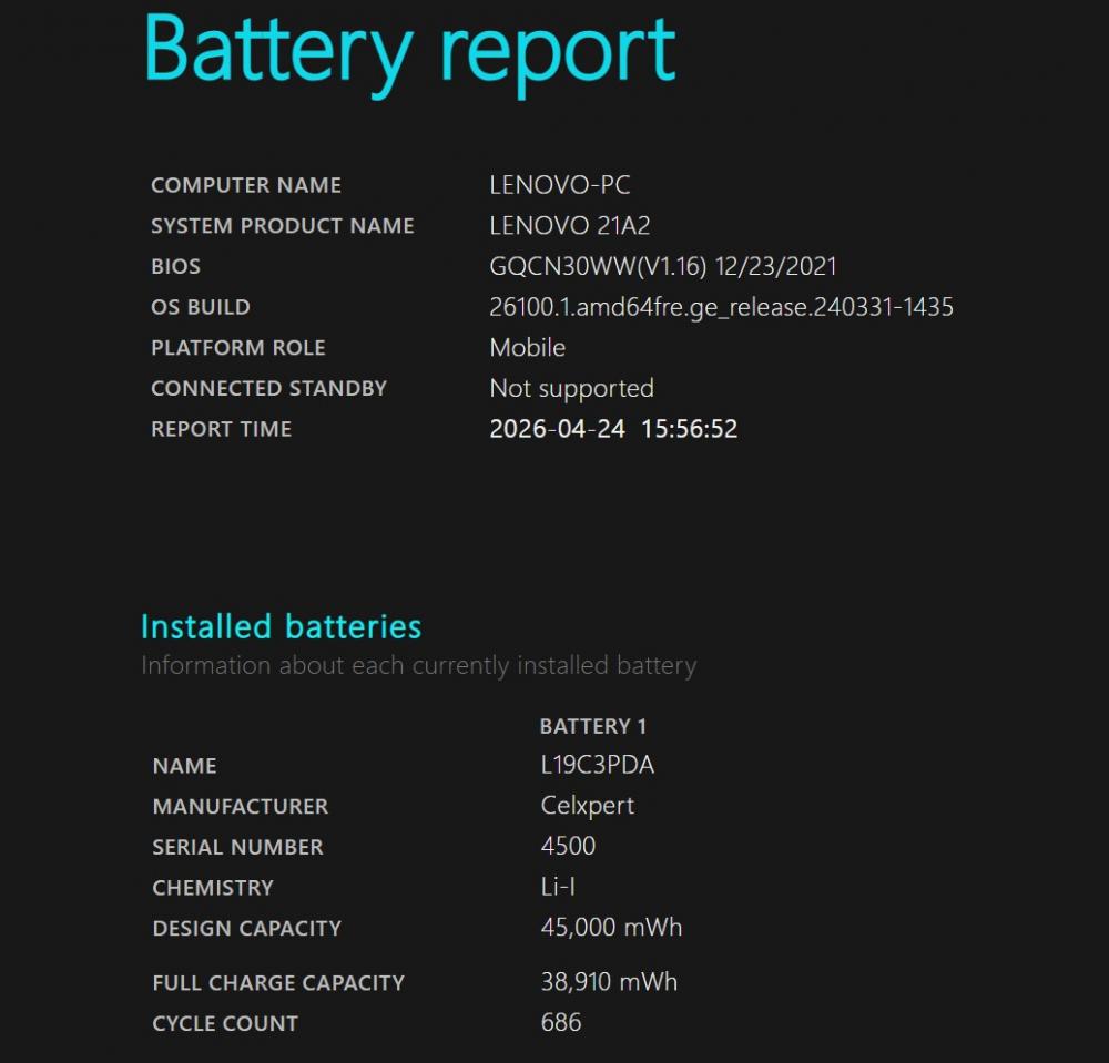 バッテリー電池の健康度は 85% です。4時間位も使用可能と表示されている。 バッテリーは消耗品の為、動作補償外となります。