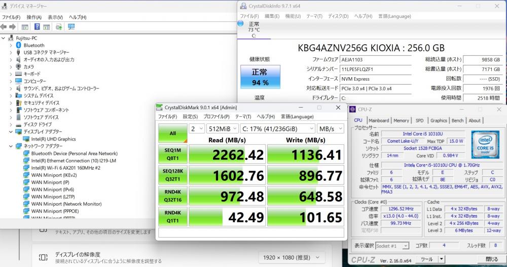 | CPU: 超高速 Intel 超高性能 第10世代Core i5-10310U 1.7Ghz、 4コア8スレッド (ターボ・ブースト利用時の最大周波数 4.4GHz) |