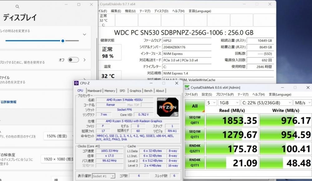 | CPU: 超高速 高性能 AMD Ryzen 5-4500u 2.3Ghz、 6コア (ターボ・ブースト利用時の最大周波数 4.0GHz) |