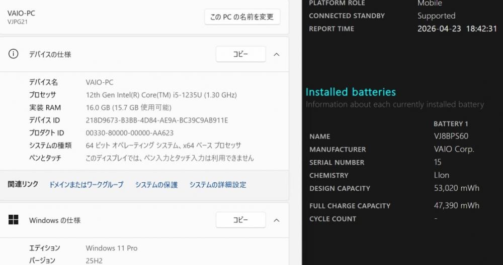 バッテリー電池の健康度は 89% です。4時間半位も使用可能と表示されている。 バッテリーは消耗品の為、動作補償外となります。