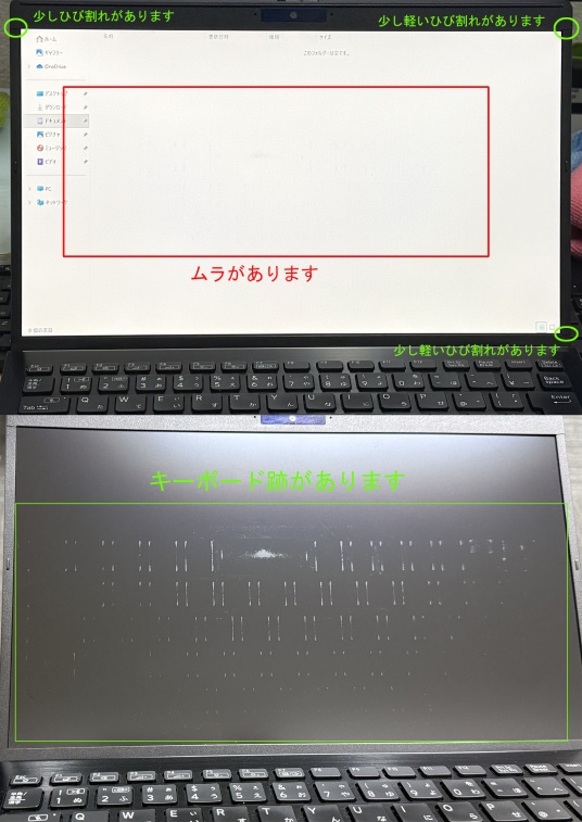 液晶写真に映るように液晶にキーボード跡とムラがあります