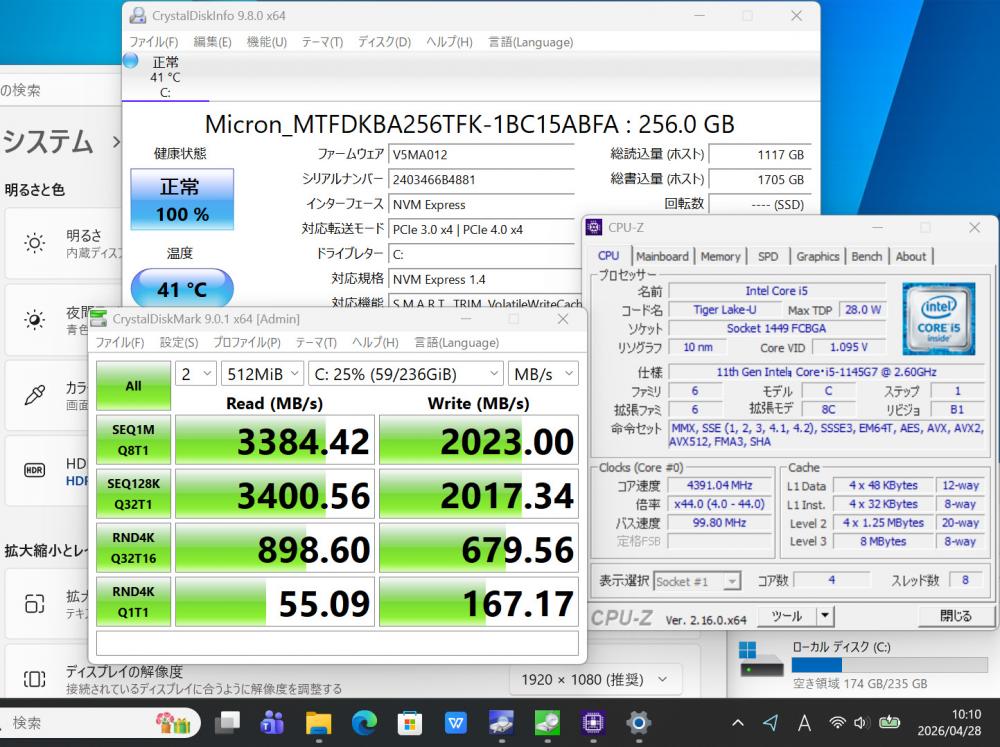 | CPU: 超高速 Intel 卓越性能 第11世代Core i5-1145G7 2.6Ghz、 4コア8スレッド (ターボ・ブースト利用時の最大周波数 4.4GHz) |