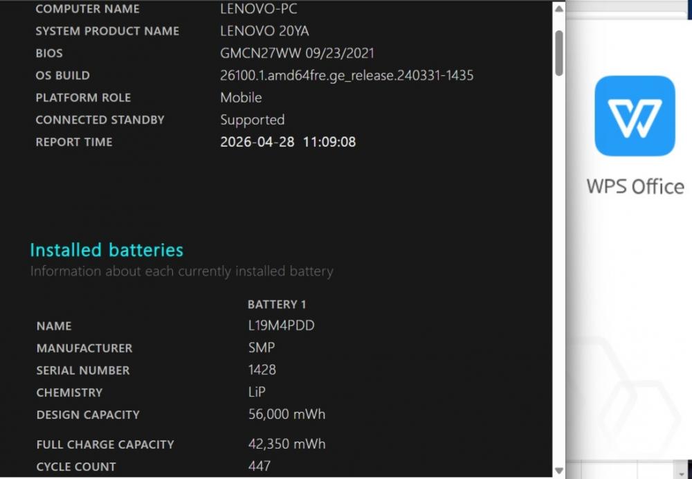 バッテリー電池の健康度は 83% です。3時間半位も使用可能と表示されている。 バッテリーは消耗品の為、動作補償外となります。