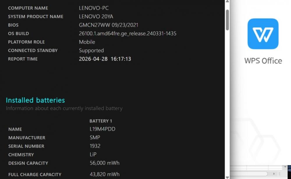 バッテリー電池の健康度は 85% です。3時間半位も使用可能と表示されている。 バッテリーは消耗品の為、動作補償外となります。